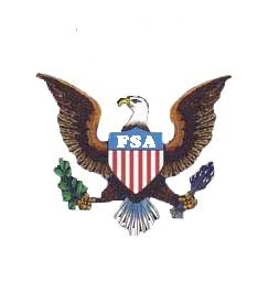 The FSA pin is their symbol. A Federal eagle looking right with a shield for a body, wings spread clutching 13 arrows and an olive branch in each talon. The shield is embossed with 13 red and white stripes (6 Red 7 White) vertical on the shield. The upper third of the shield is blue with white letters embossed FSA.