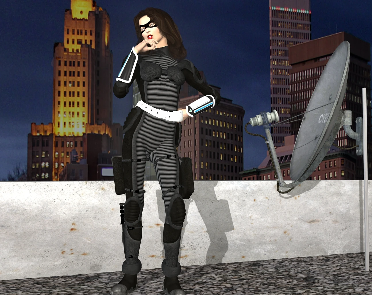 Black and white fur trimmed bustier and panty set with utility belt. Thigh boots and elbow gloves with claws. Domino mask.[1]